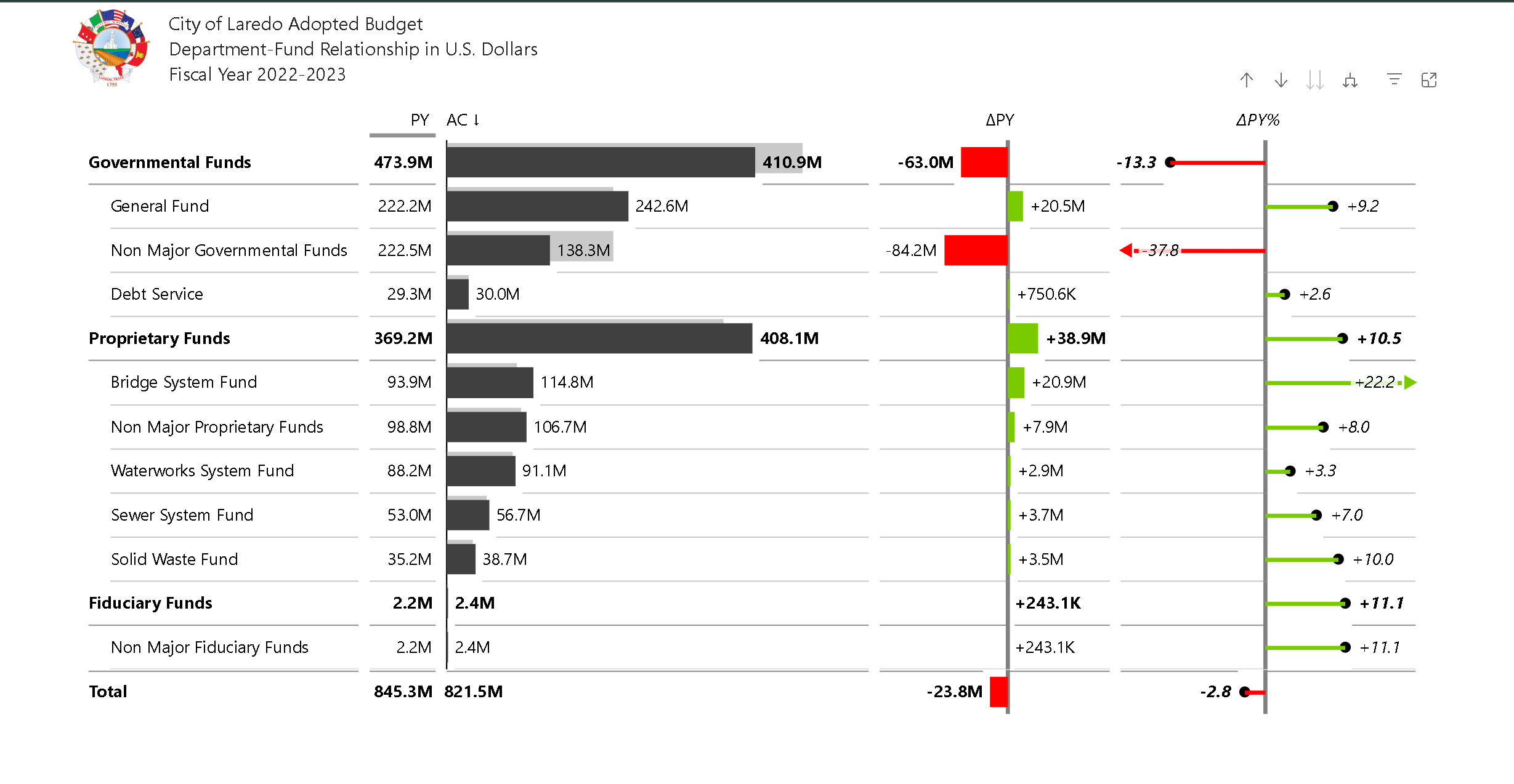 revenues, expenditures, department-fund relationships, and a listing of budgeted